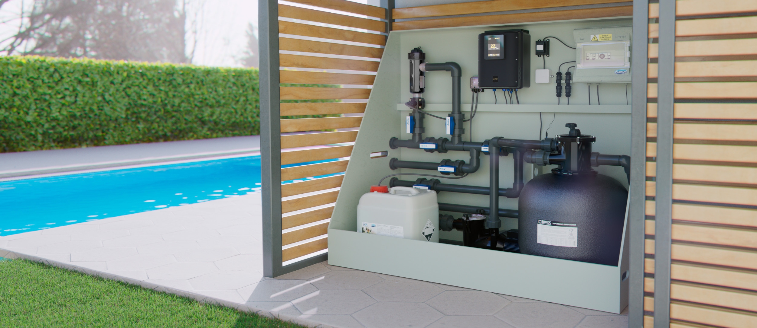 El cloradero salino ayuda a mantener el agua de su piscina limpia y saludable en todo momento. Además, se pueden conectar hasta 4 dispositivos adicionales a todos los tipos de cloraderos. Puede utilizarlo para hacer funcionar el filtro y la bomba de calor o para encender las luces de la piscina.