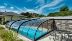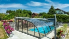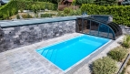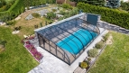 Como el jardín está situado en una pendiente, el Sr. K. optó por un sistema de cubierta DALLAS AN DIE WAND, que se adapta perfectamente al terreno irregular y permite nadar incluso bajo la cubierta. También ofrece espacio suficiente para sentarse con los amigos y la posibilidad de utilizar la piscina incluso con mal tiempo.